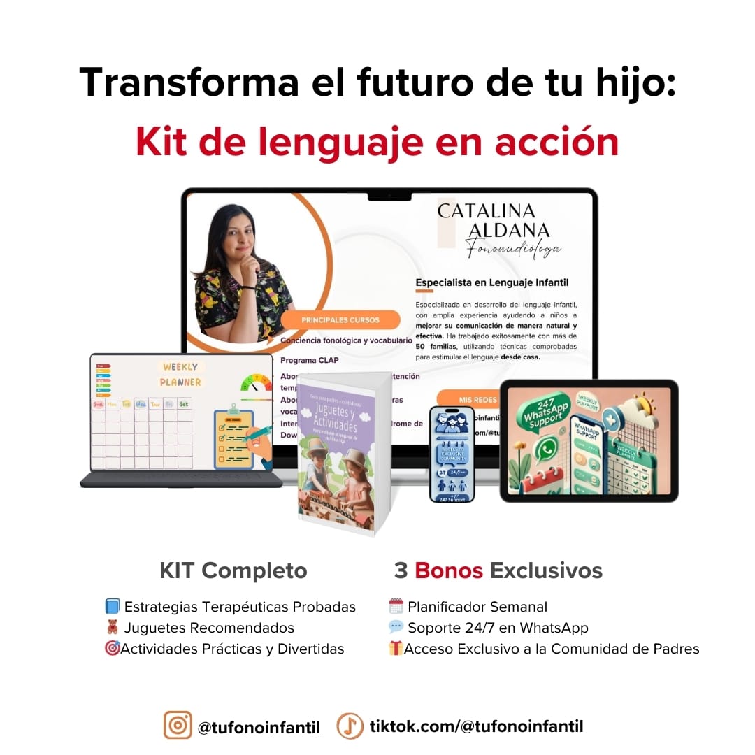 📘 Estrategias Terapéuticas Probadas: Diseñadas por Catalina Aldana, fonoaudióloga certificada con más de 50 casos de éxito en estimulación del lenguaje infantil.